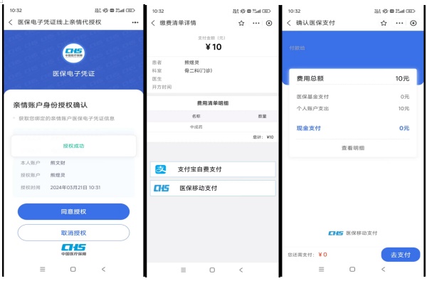 4、页面跳转到亲情账户身份授权确认界面,点击“同意授权”会出现‘授权成功’字样,页面再次跳转到选择自费或医保支付,点击“医保移动支付”进入确认医保支付界面,点击“去支付”。