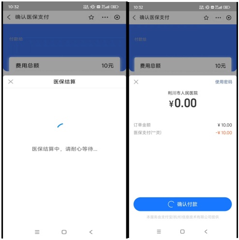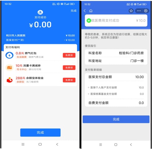 5、进入医保结算中,继续跳转至确认医保支付界面,点击“确认支付”,跳转界面后点击“完成”,就可以看到医保支付金额详情。