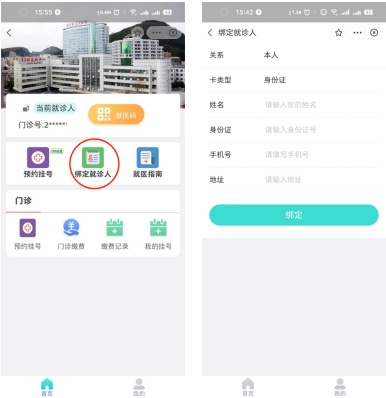 2、打开“利川市人民医院小程序”在首页点击“绑定就诊人”,按要求填写儿童就诊人信息点击确认即可添加,此功能可添加管理多个就诊人。