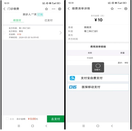 3、绑定就诊人以后进入待支付页面,可以看到儿童的待支付订单,勾选需要的订单,点击“去支付”进入下个页面,点击“医保移动支付”。